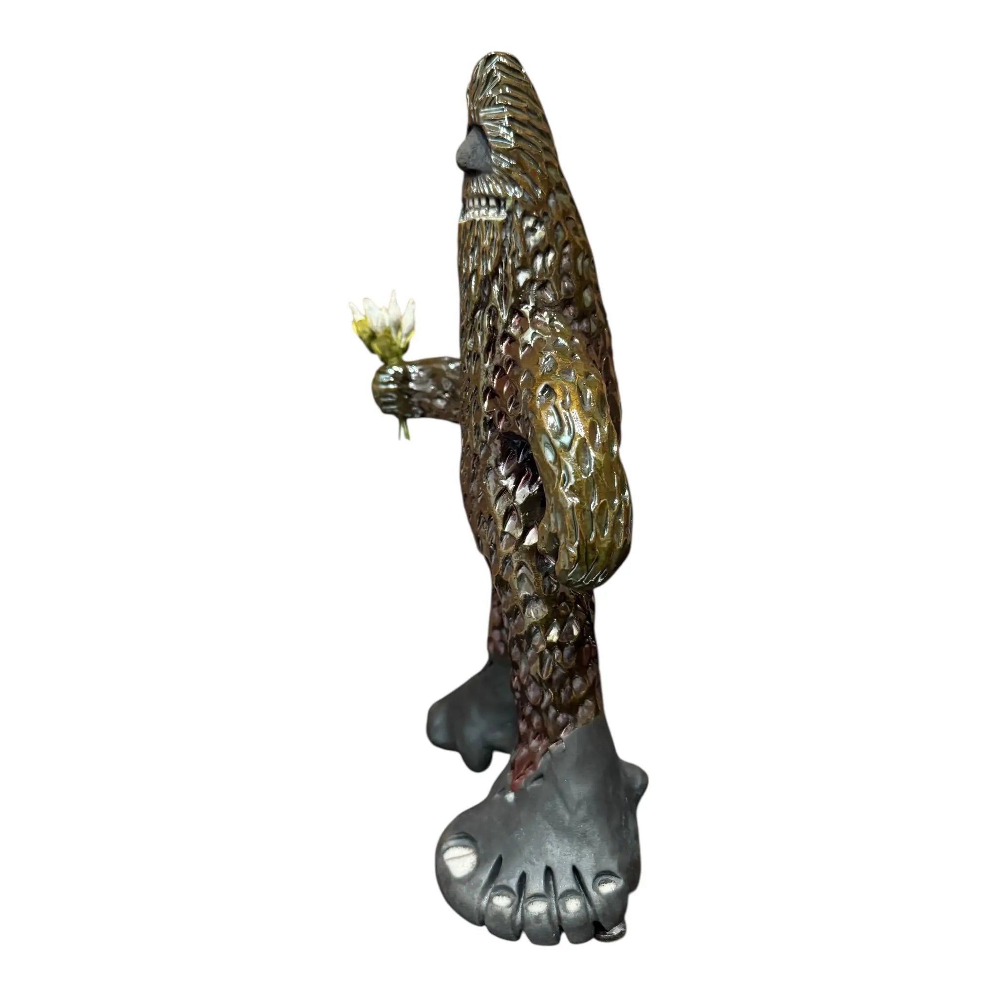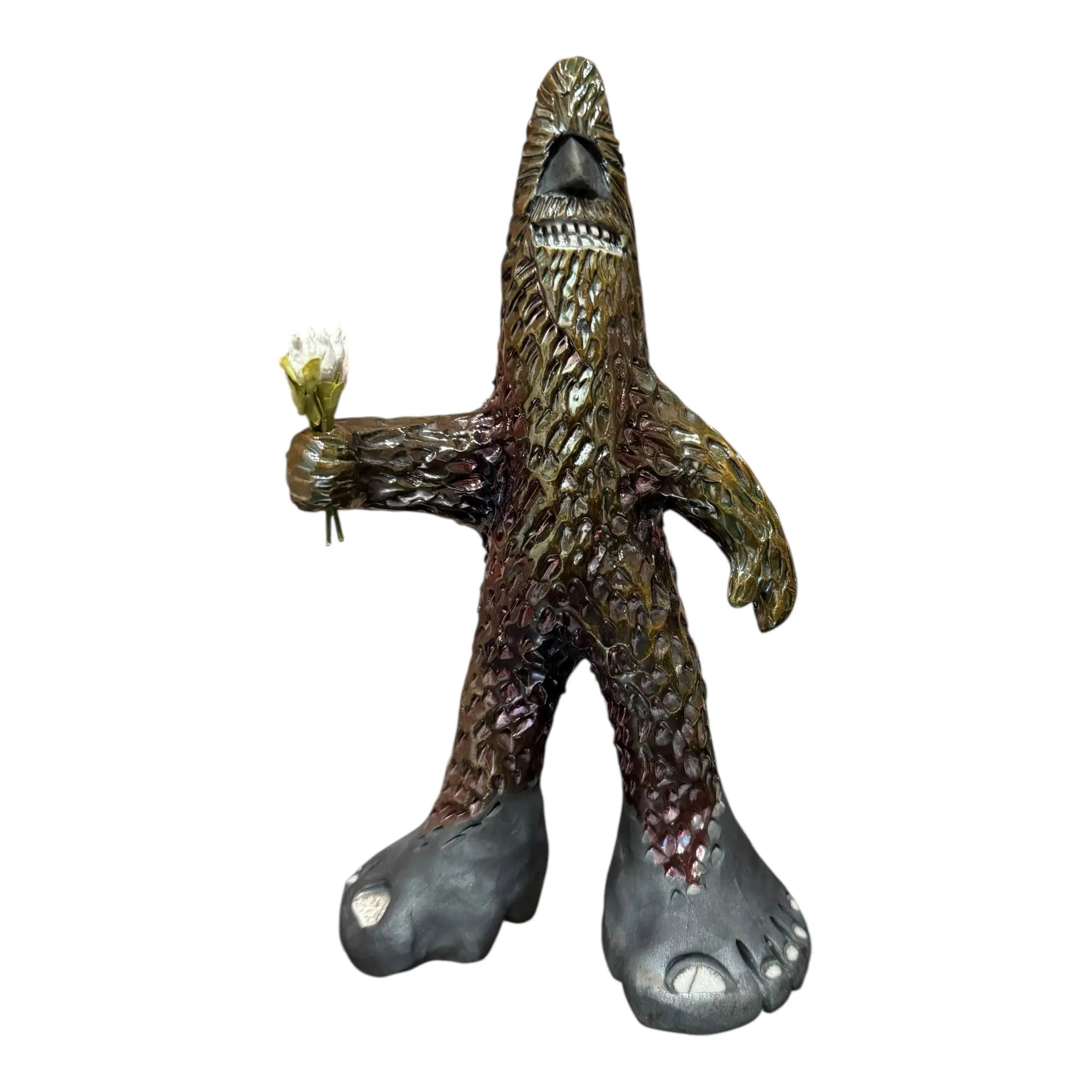 Introducing Bigfoot in a rare, tender moment. This delightful piece features the legendary creature presenting a bouquet of flowers. adding a touch of whimsy and warmth to any space. Handcrafted with meticulous attention to detail, embrace this mythical creature as he steps out of the forest and into your collection.