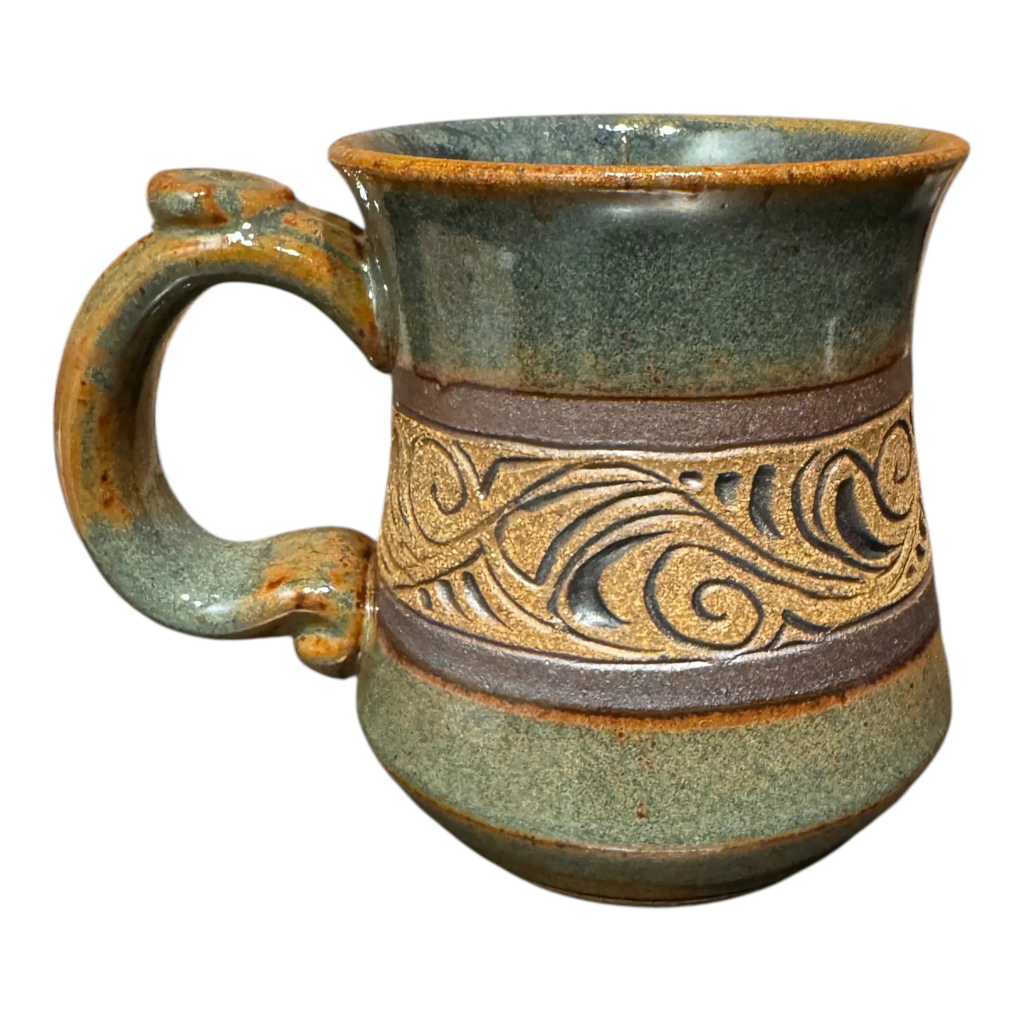 This hand-carved, wheel-thrown mug brings the warmth of artisan craftsmanship to every sip. The glaze features a deep, earthy green that gracefully breaks to rich rust tones, highlighting the carved details and adding depth and character. Because every mug is handmade, slight variations in shape, carving, and glaze are to be expected—and celebrated. Each one has its own subtle nuances, making your mug truly one-of-a-kind.