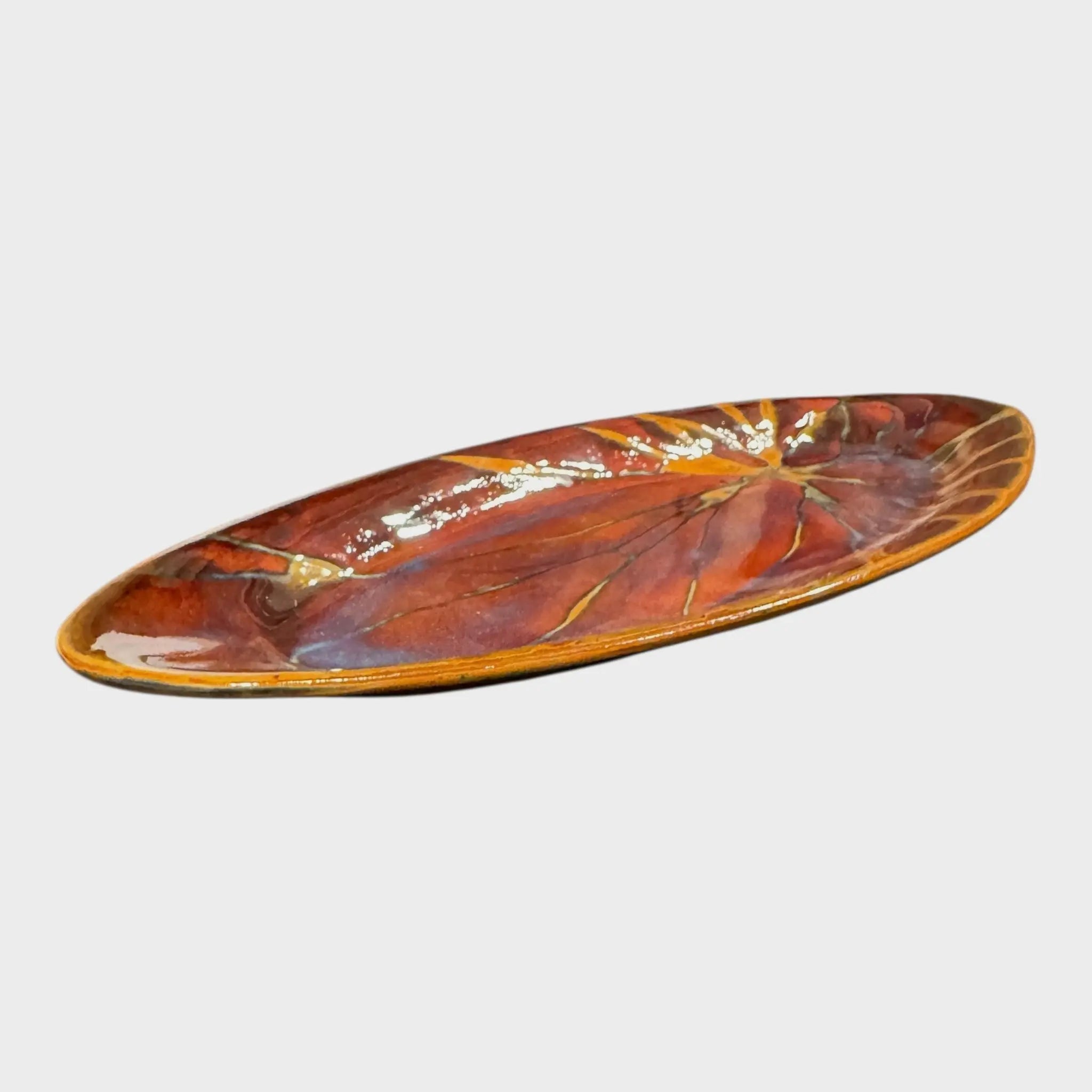 Bring a bold splash of color to your table with this narrow oval Southwest Appetizer Tray. Handcrafted in ceramic and finished with a vibrant, high-gloss glaze, it features rich rust red tones with golden vein-like lines and subtle smoky accents.