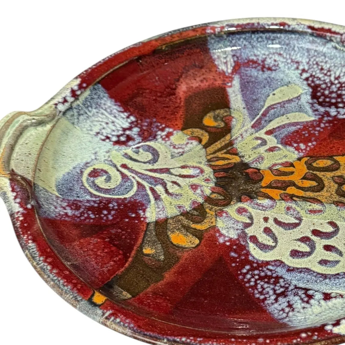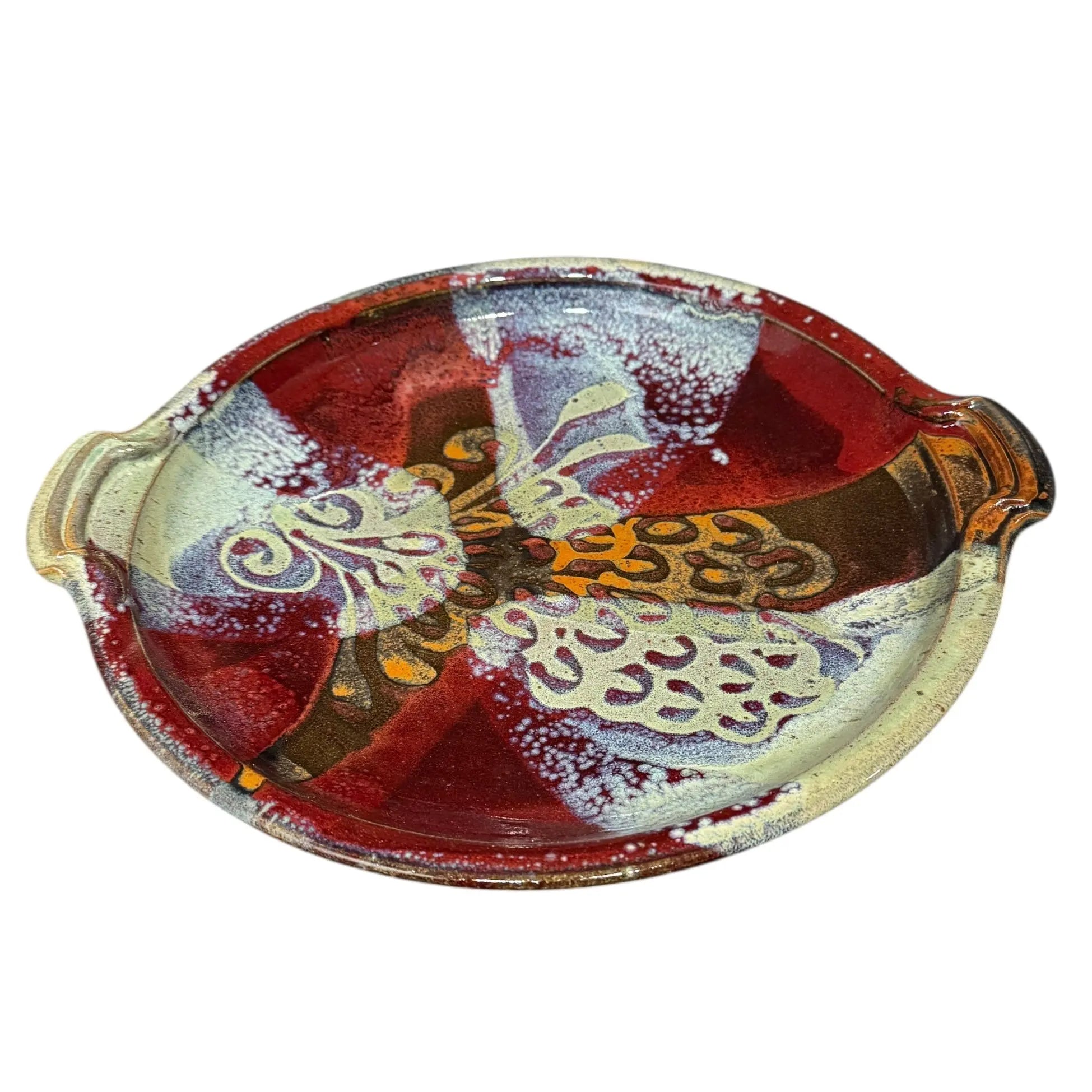 This platter is made by a local artist right here in Durango. Their vibrant red and blue glazes and surface techniques make this truly a distinctive piece. Whether you use it decoratively or for serving, this platter is a real statement piece.